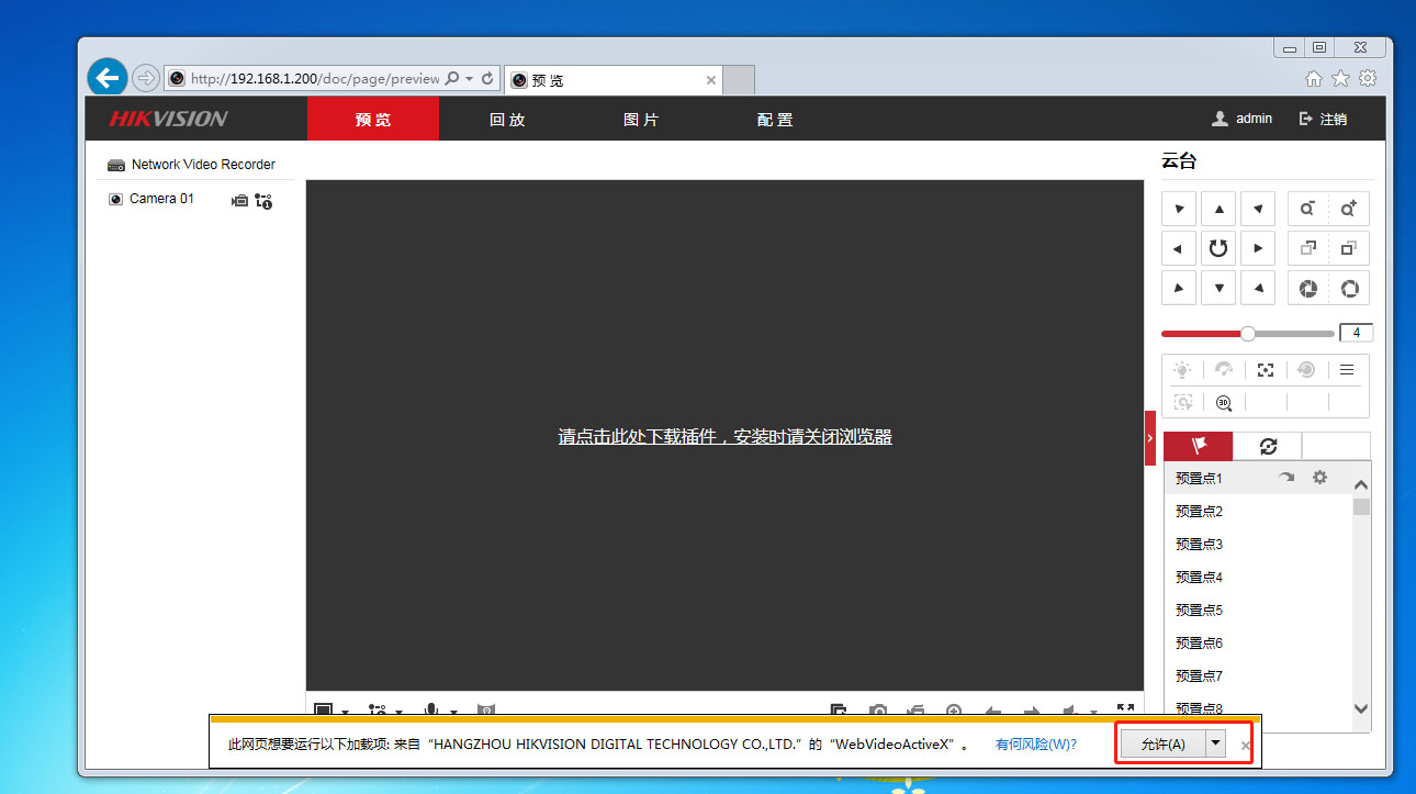 4、  重新打開瀏覽器,輸入??低曚浵駲CIP,登錄到錄像機,如下圖,點允許。